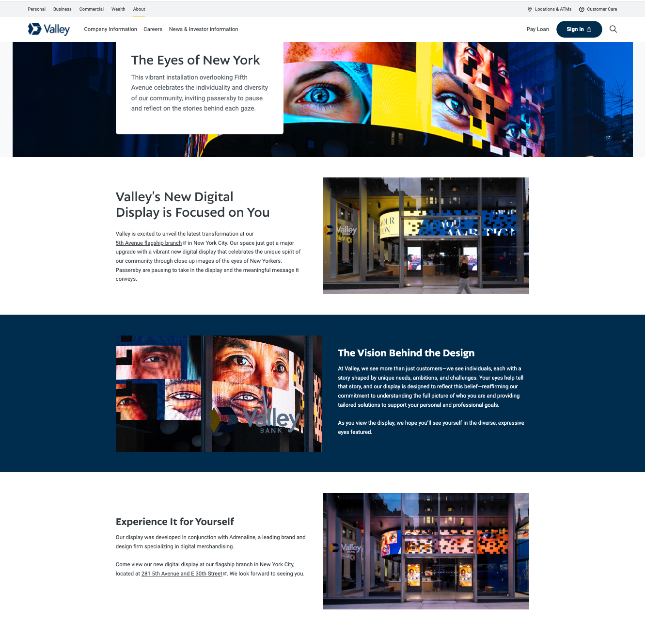 After completing the 2024 brand refresh, Valley Bank had a new identity but no public presence. The recently renovated 5th Avenue flagship presented the perfect opportunity—and pressure point—for the 2025 external launch.